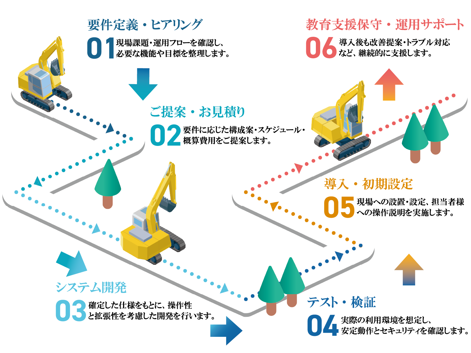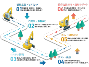 開発 、 導入 、 教育 、 運用サポート まで一貫した体制で現場を支えます。